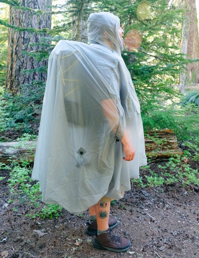 Hiking ponchos cover you and your pack, so no water funnels from the hood down your back. They are airy: vapour escapes easily, and many incorporate studs to close sides, or a belt to prevent wild flapping. Others such as the Gatewood, above, have hoods that cinch closed, so the poncho doubles as a tarp or tent… but what, enquiring minds want to know, do you wear while you’re setting up in rain?