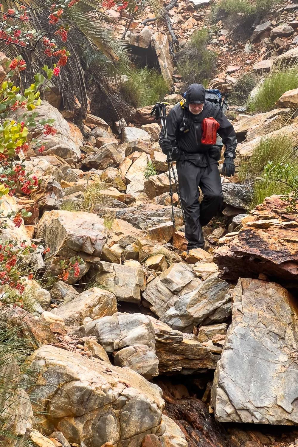 Geoff in his ultralight breathable shell on the Larapinta Trail. It was cold (-8C/17F with wind chill), drizzly and, yes, windy!