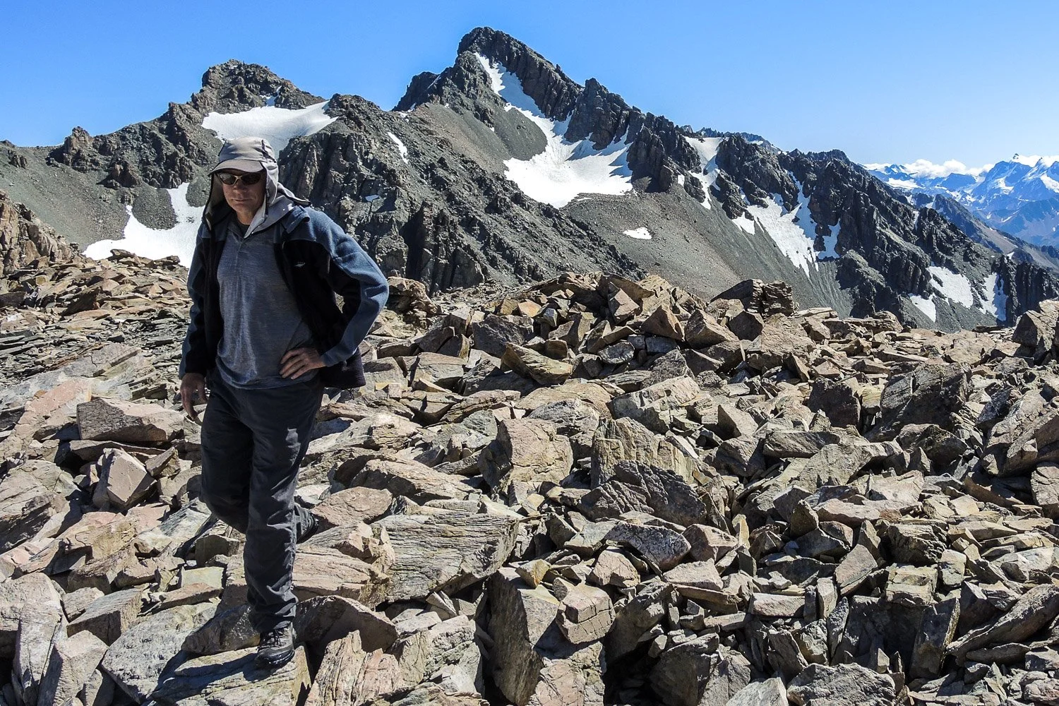 Multiple layers in New Zealand. Geoff now wears a much lighter fleece insulation layer because this one is overkill on a multiday hike, and very heavy to carry.