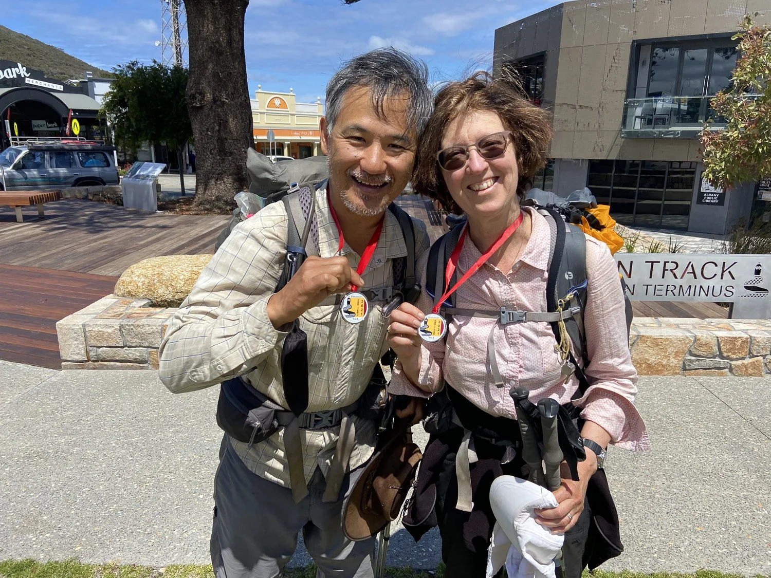 Our friends Patrick and Helen wearing their trusty hiking shirts at the end of the long distance Bibbulmun Track. Pat is carrying his phone in his shirt pocket.