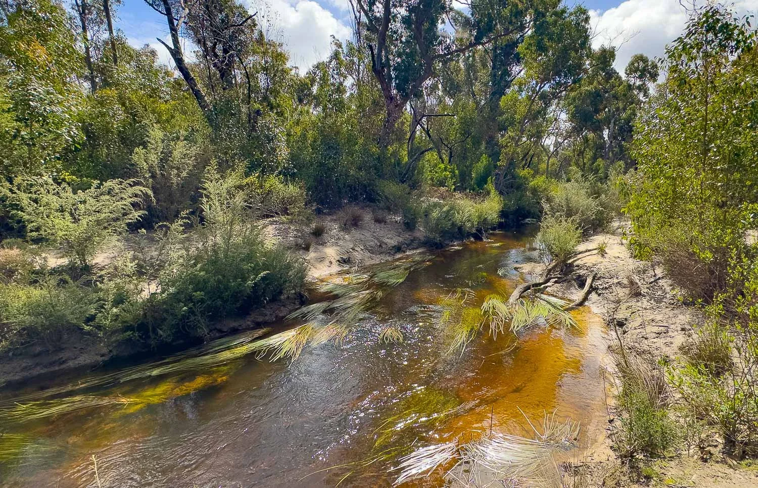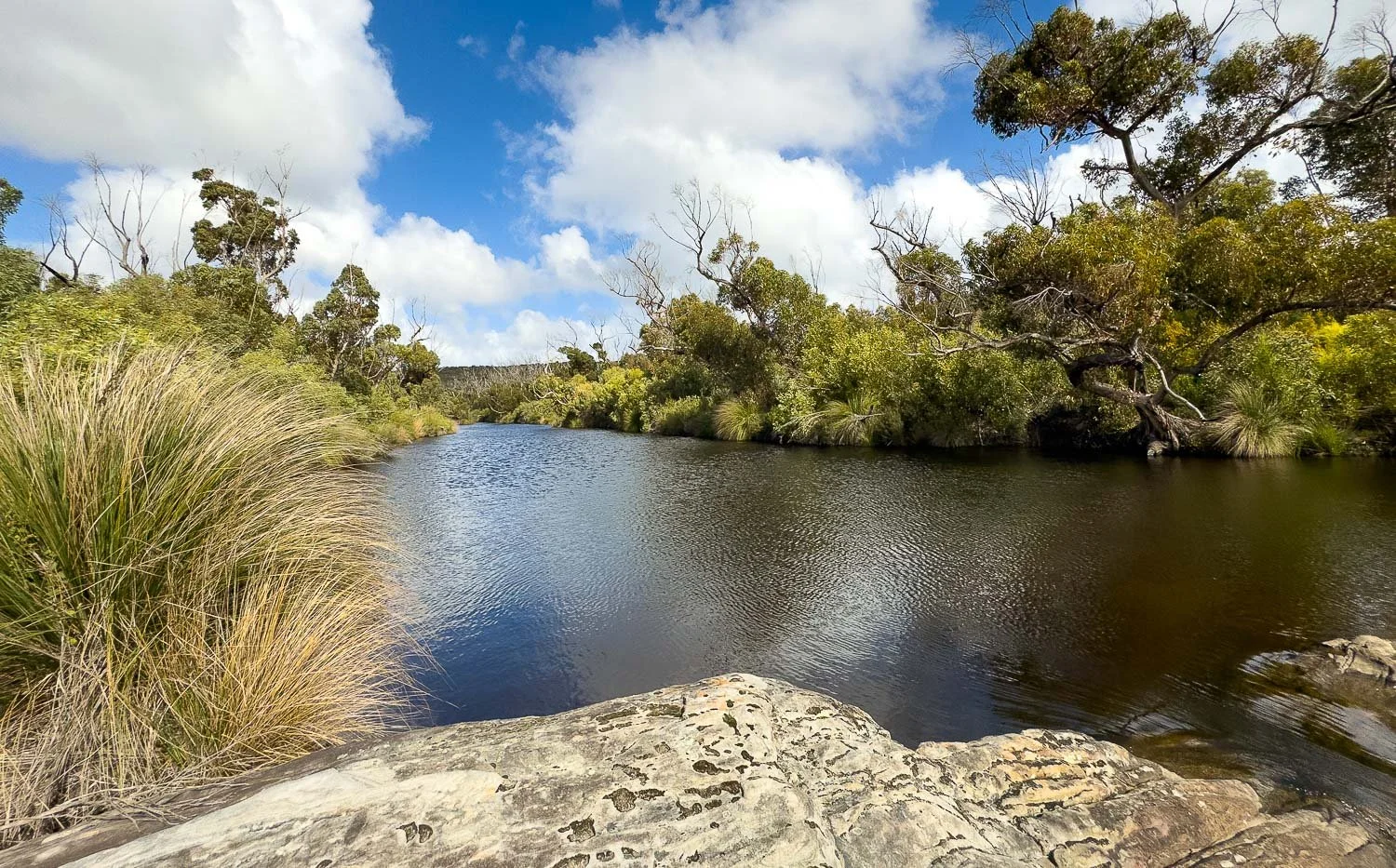 Cascades, platypus pools, a lunette, lagoon and wildflowers along the Rocky River