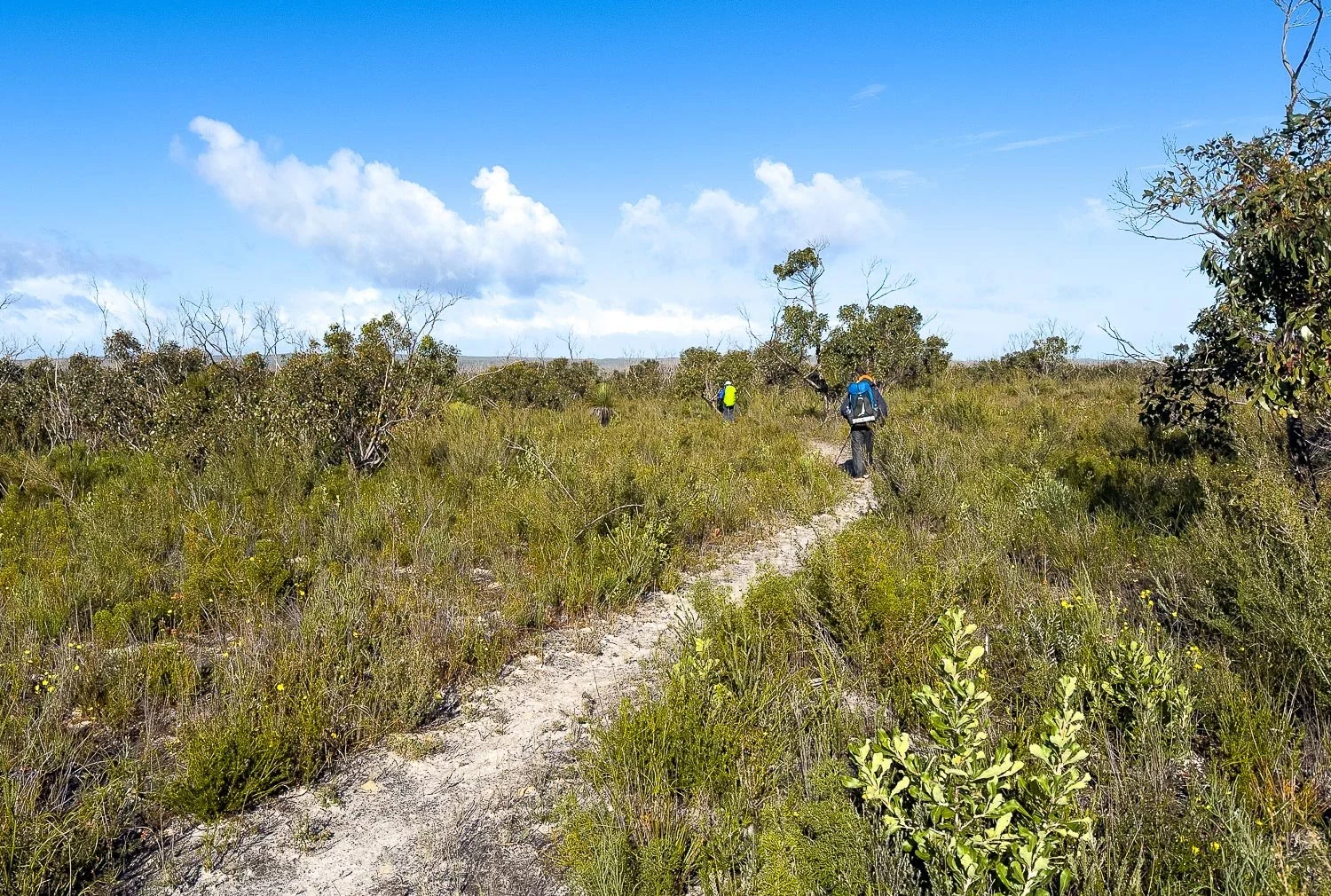 After the forest earlier, the terrain opens up with low heath dotted with scattered mallee, re-shooting from the 2019-2020 bush fire that devastated so much of the island. However, as you can see, the native vegetation has bounced back. The circular lunette that was discovered after the bushfire, and whose crest you partially traverse, is now scarcely visible through the regrowth.