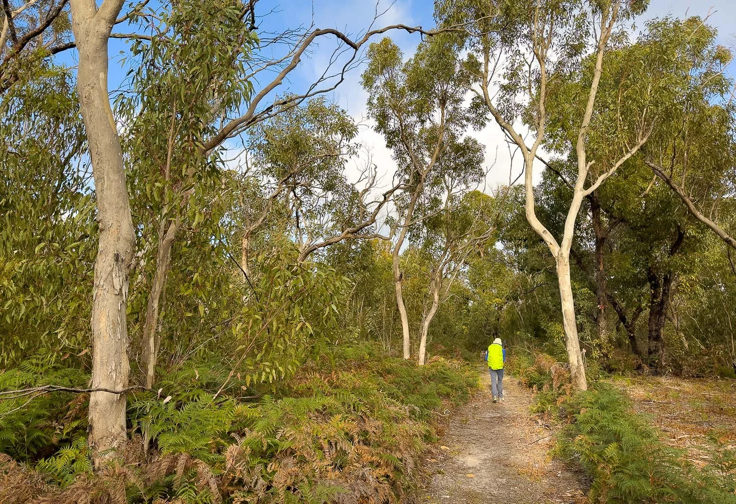 The hike begins behind the Visitor Centre through tall stringybark forest with a lush understorey of bracken and shrubs.