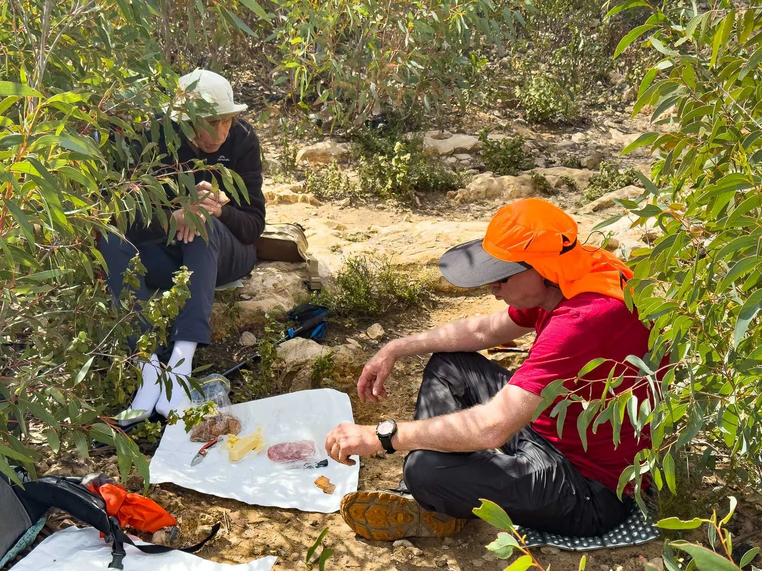 Lunch at Pardalote Lookout. Dehydrated lunches are light, but the first day is often a good time to indulge in cheese and salami, here with Geoff’s homemade sourdough crackers. Small, light pocket knives are, in our opinion, essential on trail. Many people carry Swiss Army knives but I never used 95% of the attachments so chose a plain knife instead.