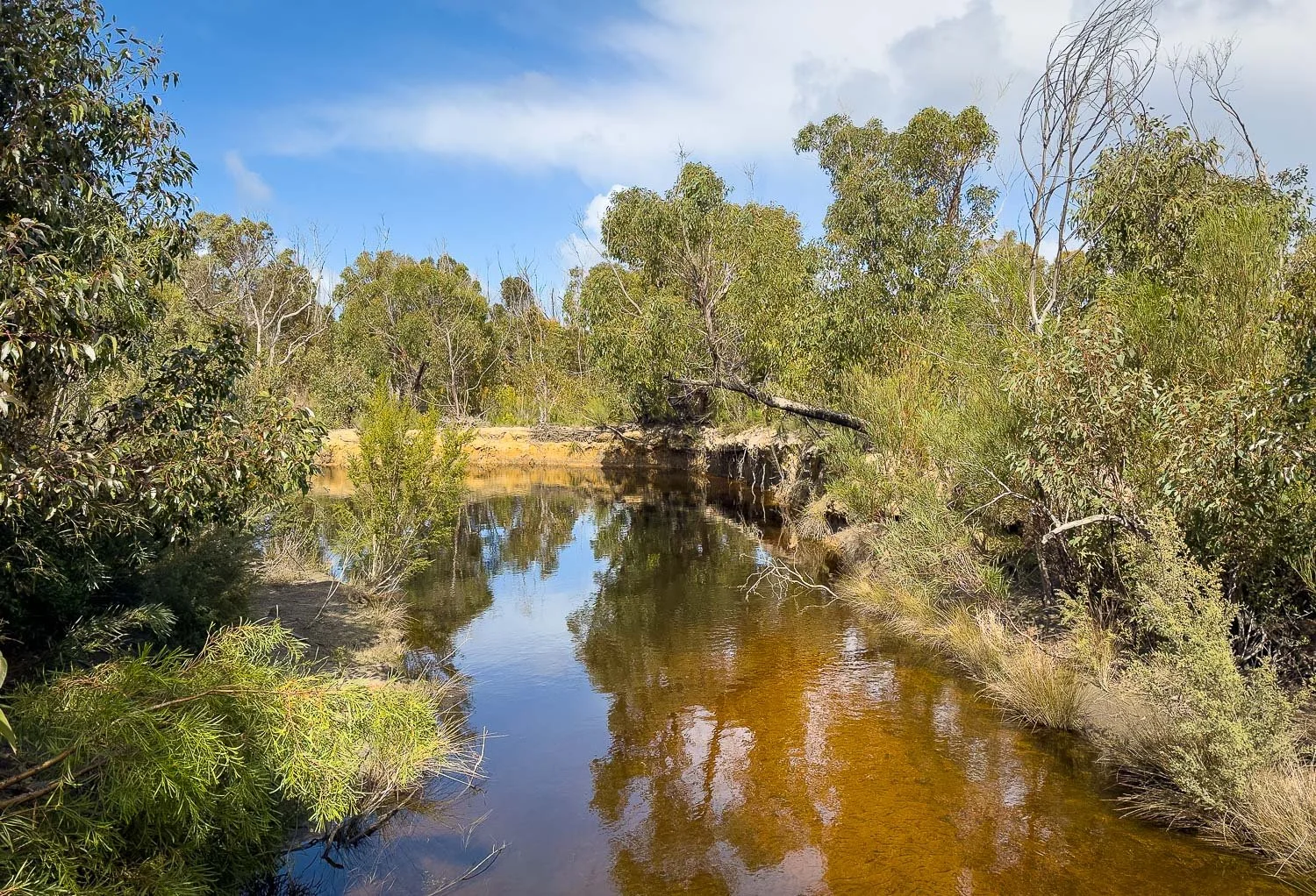 Once you reach Rocky River, you follow its banks for most of the day. Ppass a beautiful lagoon, the platypus pools, a creek with picnic table for second breakfast, skirt a lunette, climb a lookout, and sit on sun-warmed rocks beside rushing cascades. The wildflowers and variety are superb, varying from forest to mallee, tea tree and heath. At the campground, watch wallabies while you eat dinner at one of the outdoor tables, and listen to the eerie cries of bush stone curlews into the night.