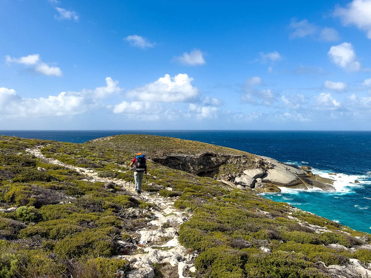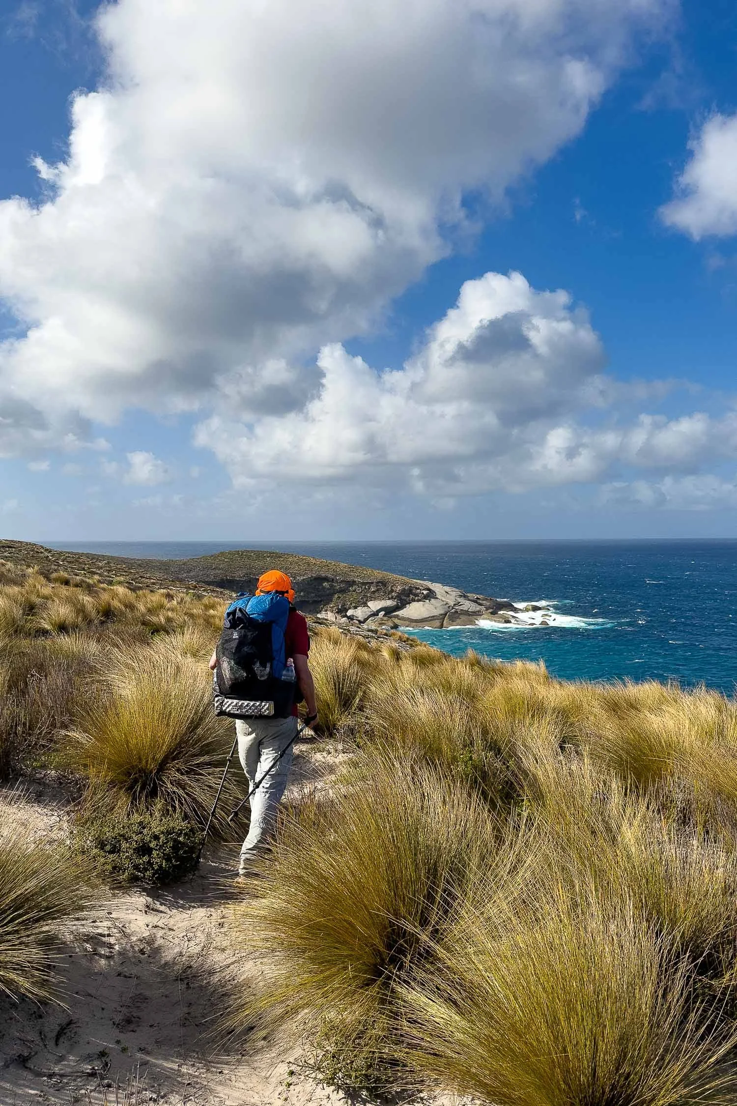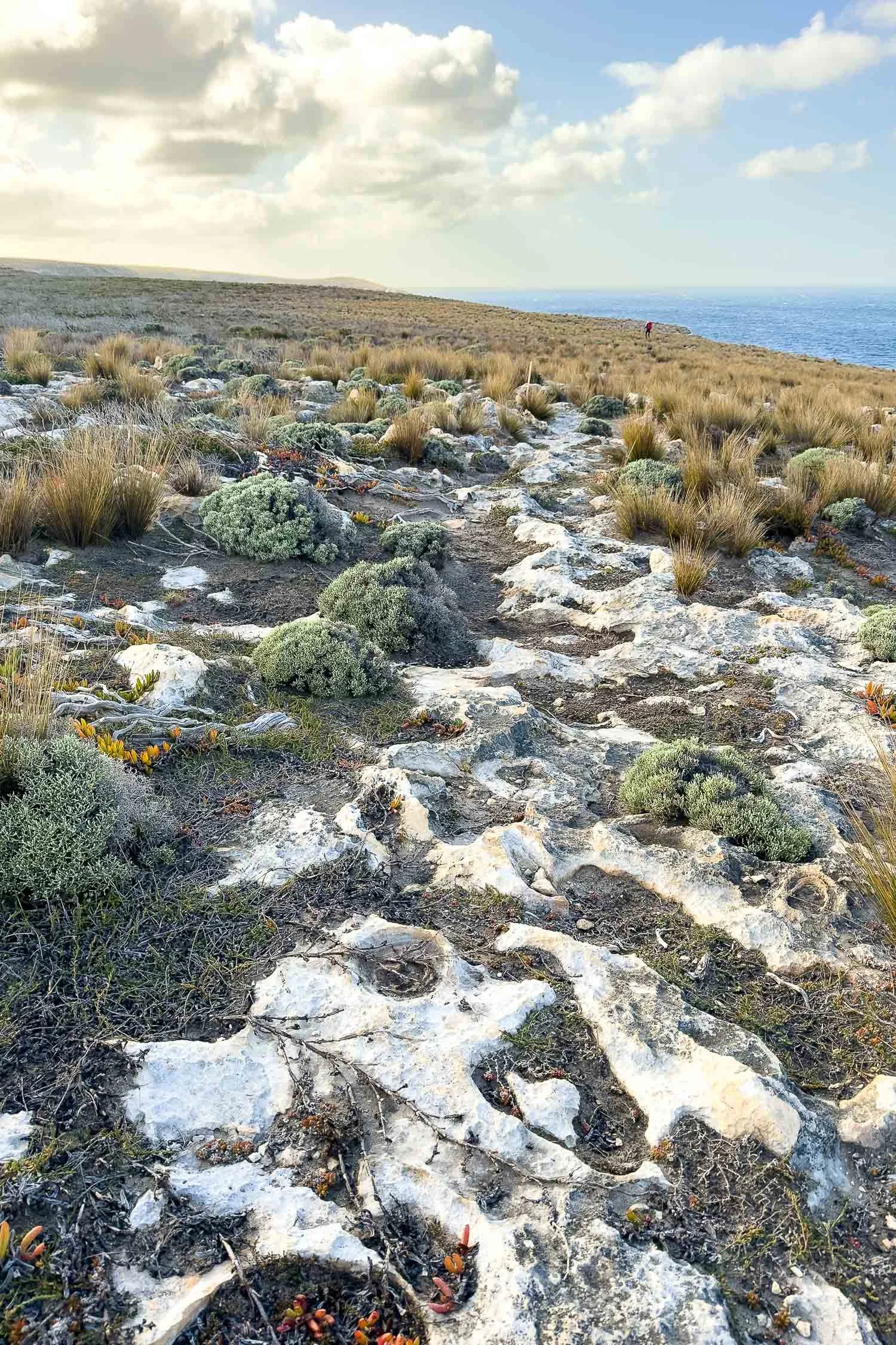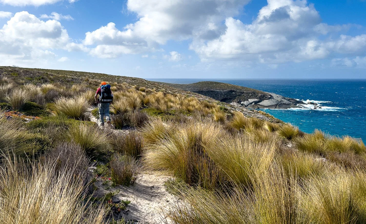Through a grassy section towards the headland, which has a spur trail going to it.