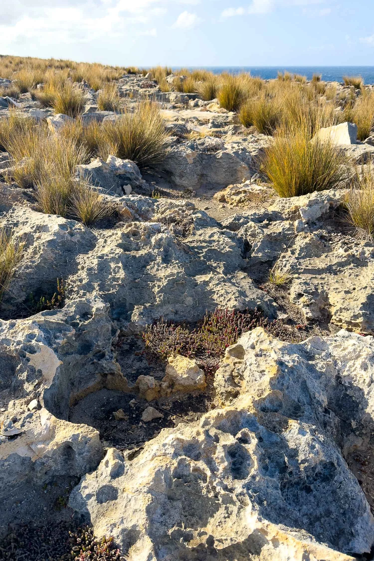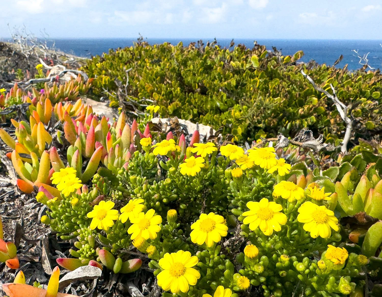 Variable Groundsel (Senecio spanomerus) is aptly named, its leaves varying from feathery and pinnate in sheltered locations, to fleshy as here on the exposed coastal limestone.