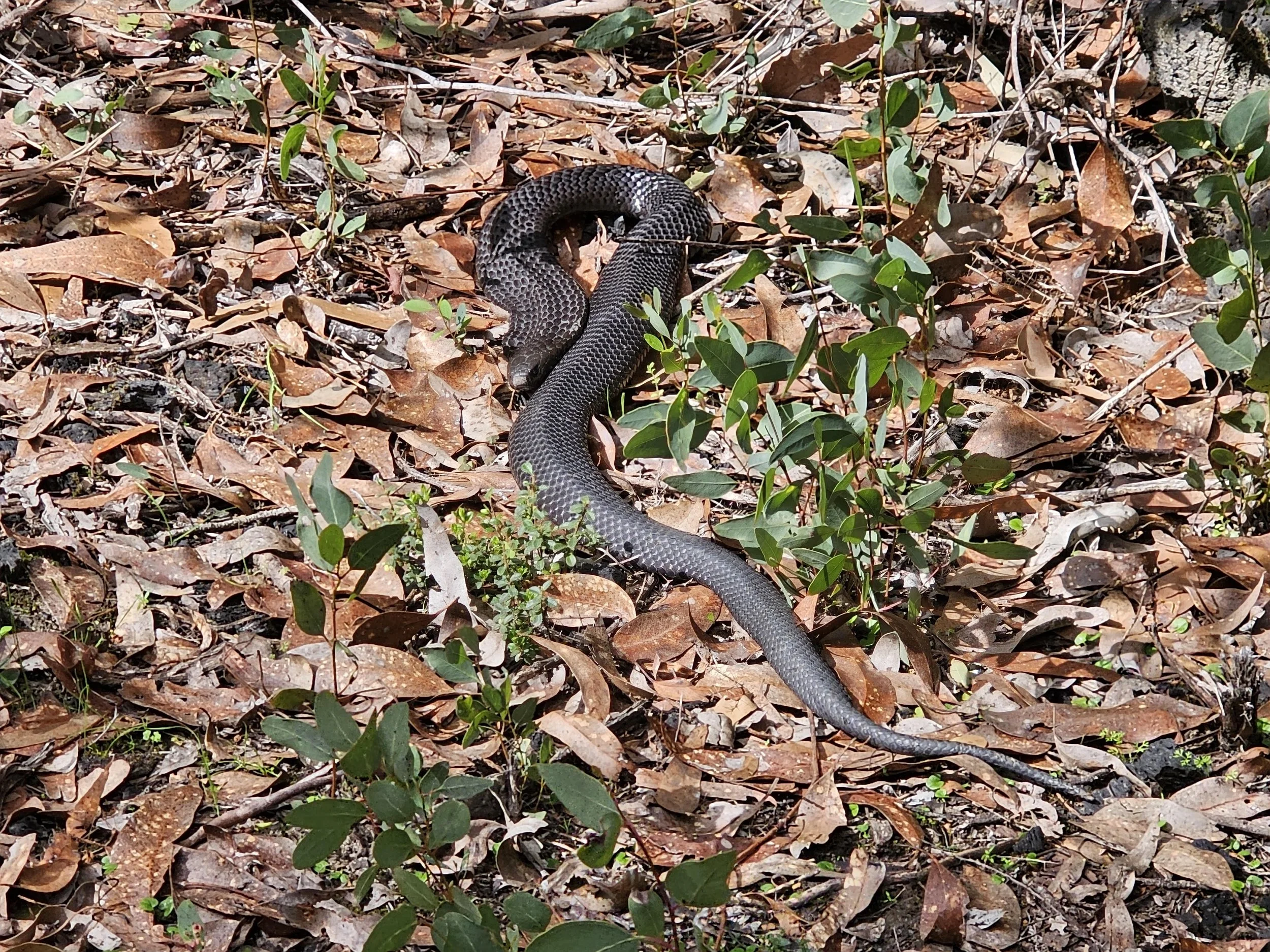 The people hiking at the same time as us were lucky enough to see this Black Tiger Snake (Notechis scutatus), not quite as harmless! They flatten to absorb more sun, but this one has probably done so to express its disapproval. (Image Credit: Robyn Liddle).