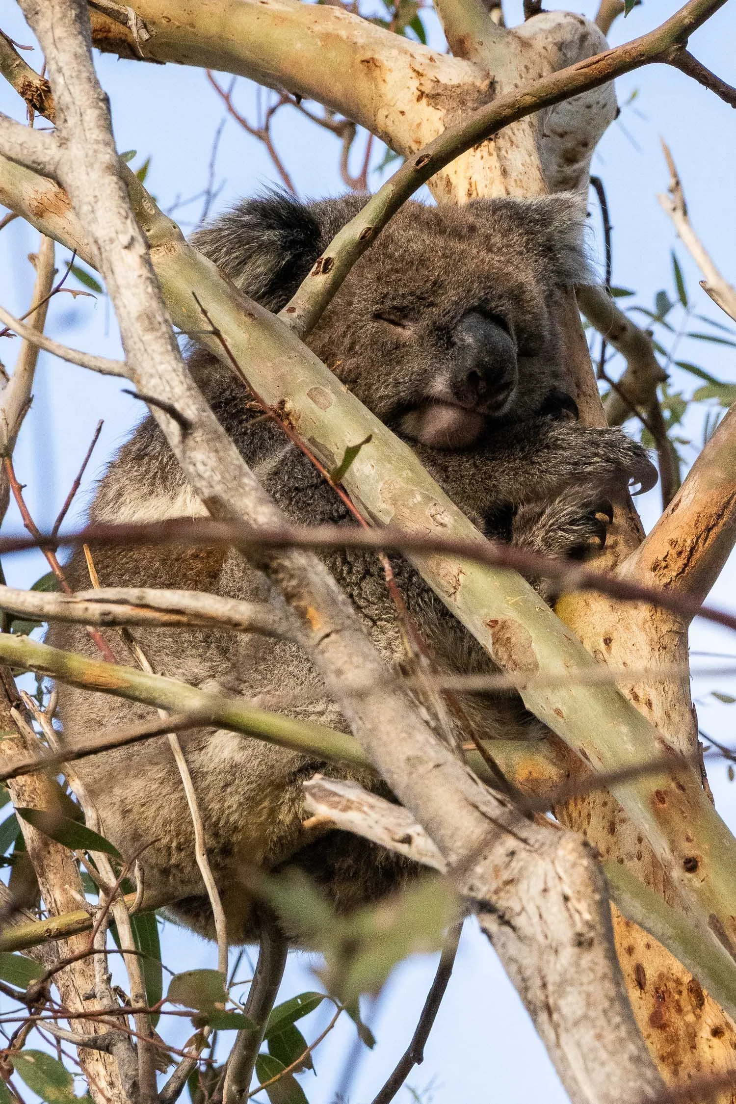 A koala dozes in a tree beside the hut. Although they are badly inbred, they are also the only koalas in all of Australia to be chlamydia-free. This makes them an important ark population should, for example, a particularly virulent strain decimate the mainland animals.