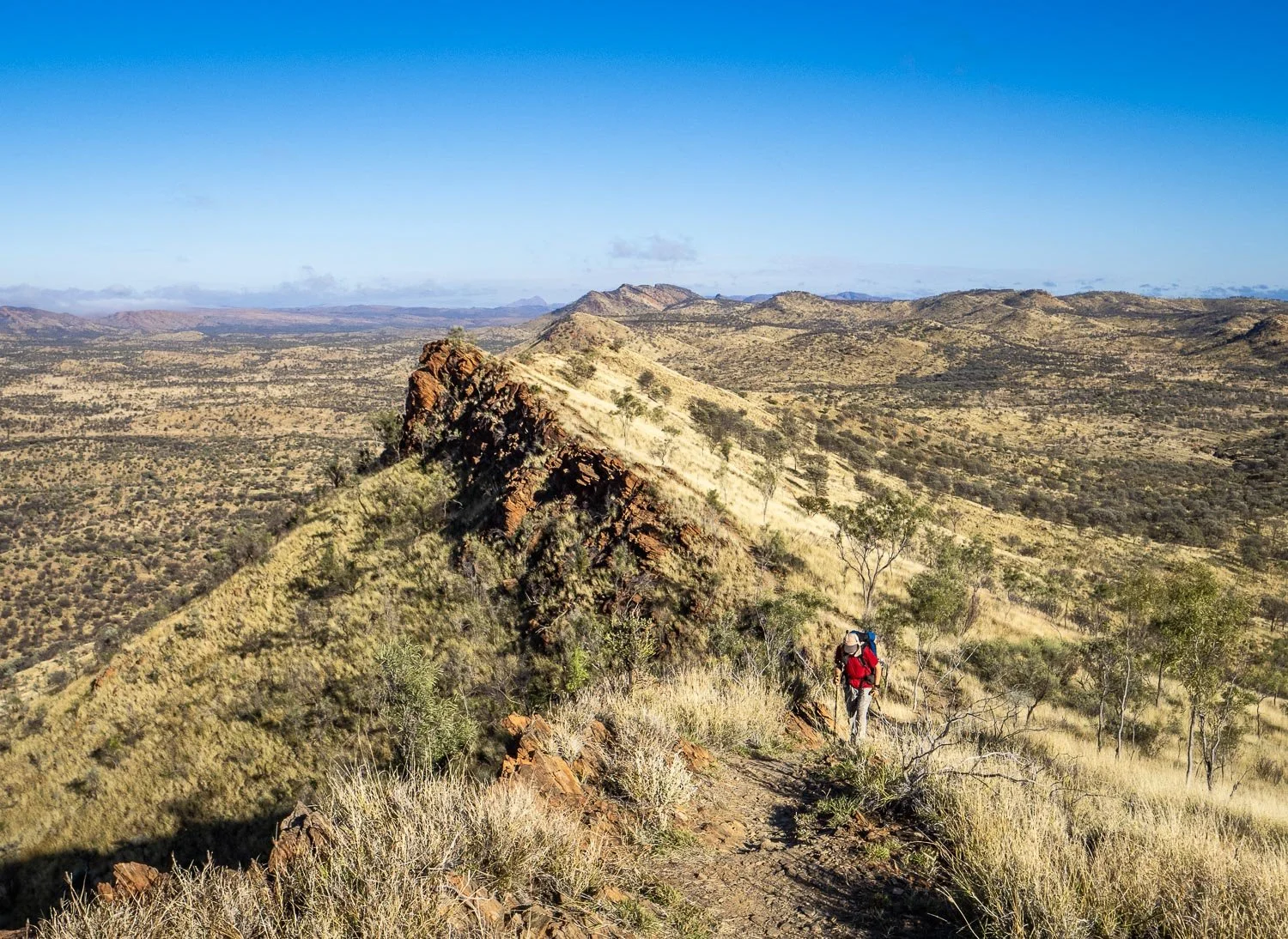 This section starts with fun scrambles in gorges, plus high vast views from ridges. You’ll then experience plenty of variety as you follow a flower-filled valley before ducking north through a gap with a little scrambling to the beautiful Fish Hole. The walking becomes easier with wildflowers, sandy riverbeds with impermanent waterholes, plains, desert woodland and gaps with pretty waterholes. Less rugged than the ranges further west, the hike along the edge of Euro Ridge still has marvellous views the entire way. Once you descend, you gradually begin to see railways, roads and bridges, and to hear traffic over the last few kilometres into Telegraph Station.