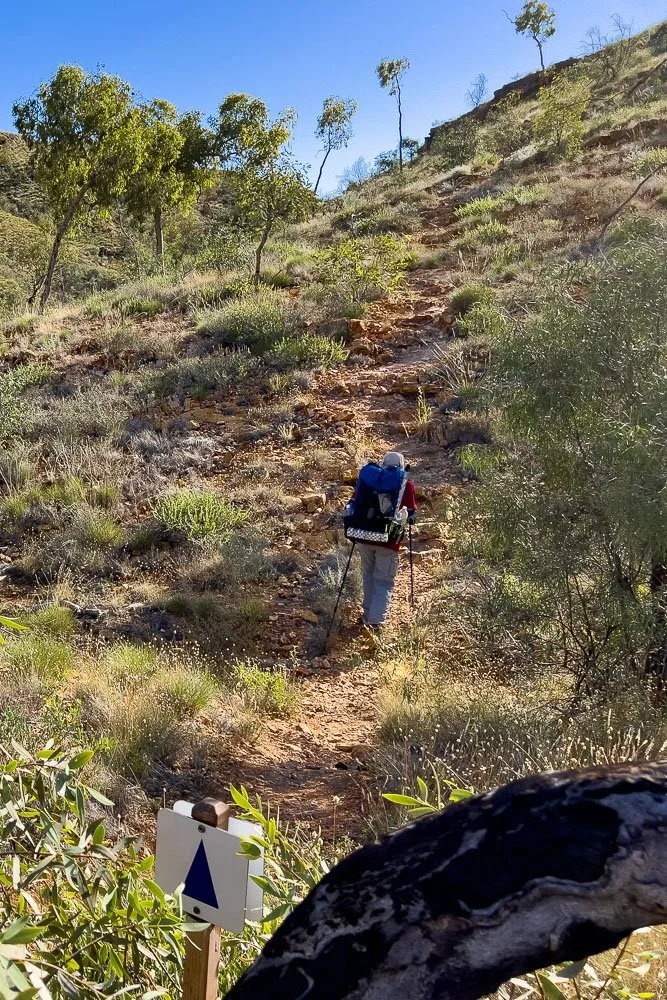 Today’s hike has no major water crossings or steep climbs or descents, but there are constant small ups and downs. If it’s forecast to be hot, simply leave early, as much of the terrain is open rather than mallee. Slower hikers should have no trouble reaching Ormiston Gorge by early or mid afternoon: it is all very doable.
