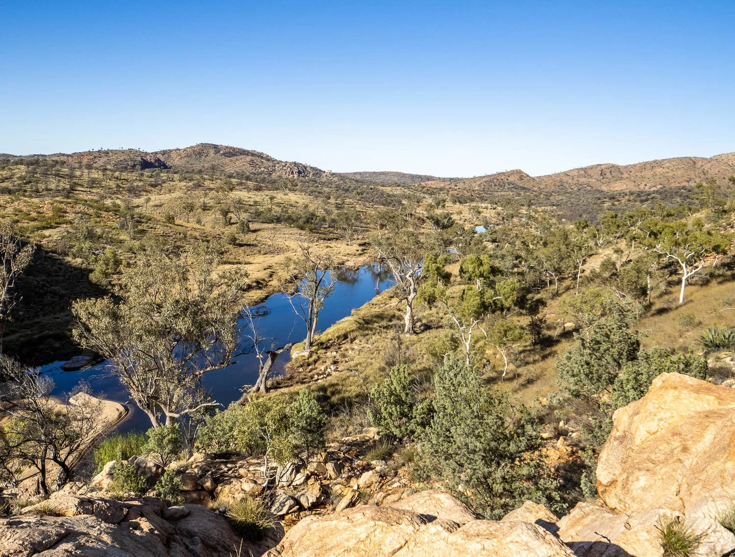 From Tangentyere Junction, today’s 14.4km/8.9mi hike to Mulga Camp has plenty of variety as you follow a flower-filled valley that gradually opens out to a plain before narrowing and ducking north through a gap with a little scrambling to the beautiful Fish Hole and a series of pools (no camping permitted). On the other side is Jay Creek campsite off a short spur trail, where you’ll collect water if you haven’t already done so at Fish Hole.