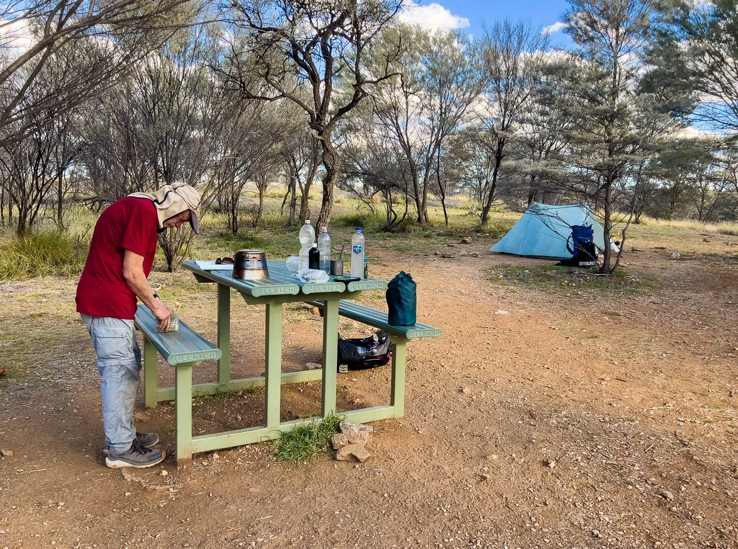 At Mulga Camp. No shelter, but two picnic tables, plenty of well-spaced campsites, and a toilet with a small rainwater tank that is kept full for hikers.
