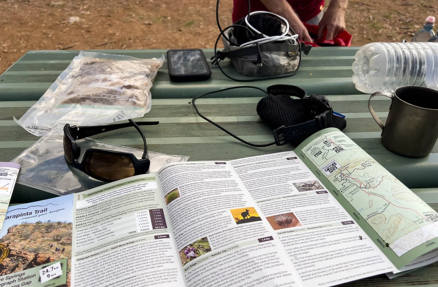 … with more around the hut. If you’re hiking from Miller’s Flat or even Standley Chasm via the low route, slower hikers will arrive much later in the day and stop here. We pause for second breakfast, have a chat to a park ranger doing maintenance work, then continue to Mulga Camp.