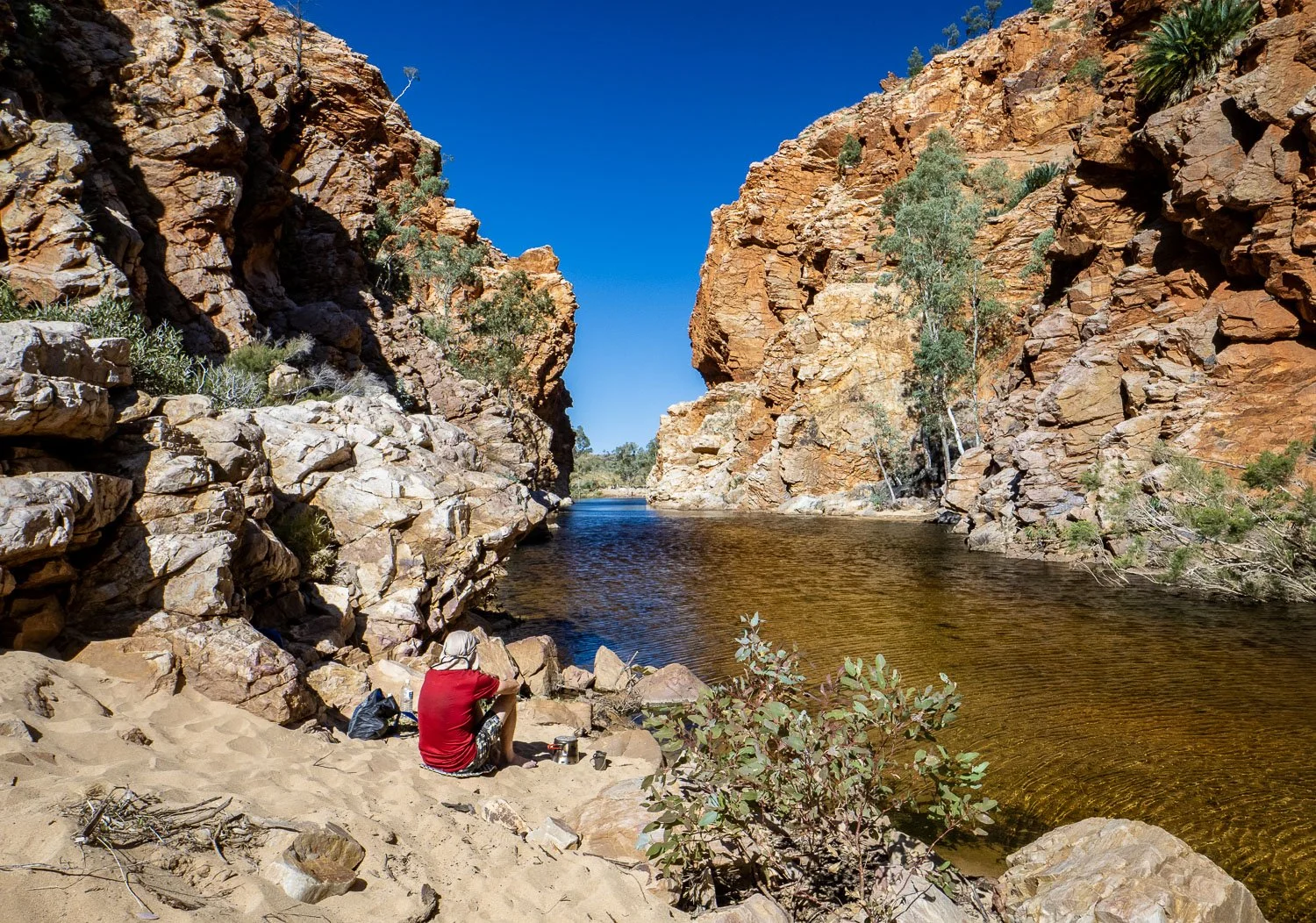 A marvellous rest day at Ellery Creek North on the Larapinta. We watched an eagle snatch fish from the water as we boiled up our cuppa. It was a diamond day to make banner memories.